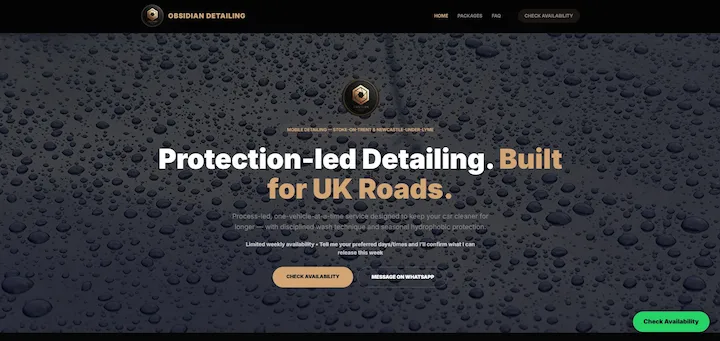 Obsidian Detailing is a live, owner-operated business inside the wider Obsidian ecosystem. This case study matters because it shows the approach in a real service-business setting: make the business feel more premium, make the packages easier to understand, and make it easier for local customers to enquire from a phone.